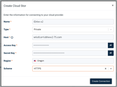 6. Enter your IDrive® e2 Region (e.g., Dallas)