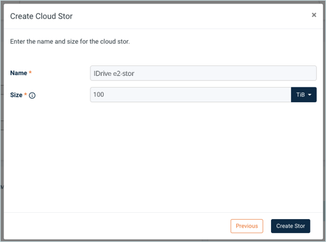6. Enter Name for Cloud Stor and set Size Quota and click Create Stor (The Size Quota is the maximum data tiered into your IDrive® e2 bucket)