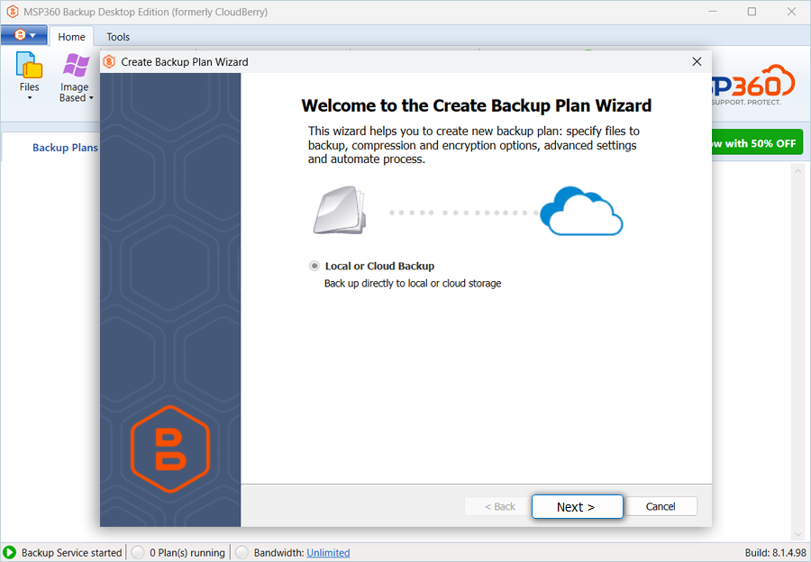 - Click Local to Cloud and then click Next in the Create Backup Plan Wizard.