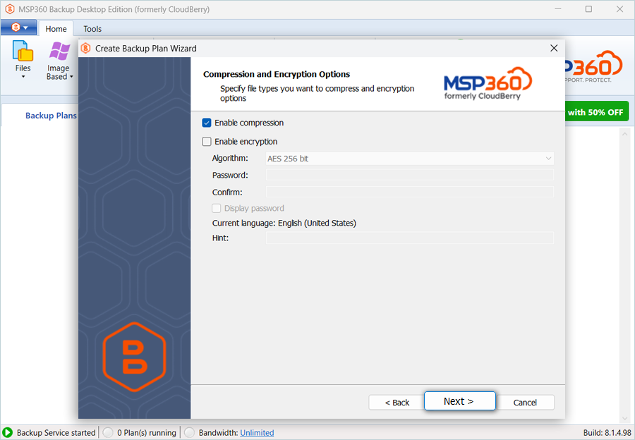 - Select/deselect the Compression and Encryption Options checkboxes according to your requirements, then click Next.