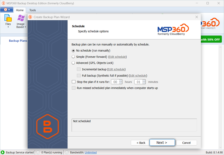- Schedule the job according to the requirements (in this example, we are not scheduling a backup job).